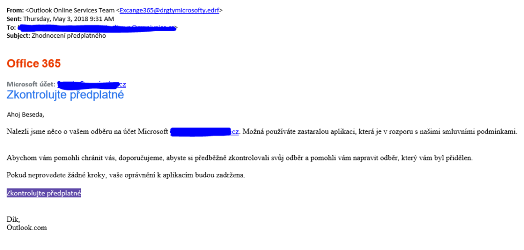 Podvodný email údajně od Microsoft informující o neexistujícím problému. Zde lze podvod rozeznat nejen z formátování zprávy, ale například také z pofiderní Emailové adresy: