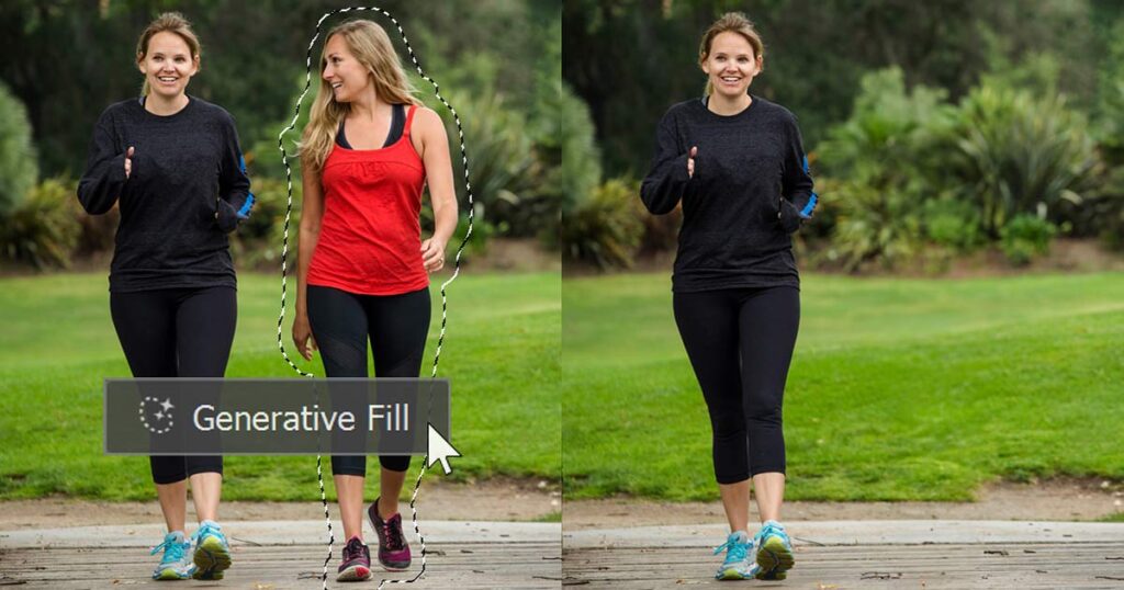 Podobně jako rozšíření obrázku dokáže AI pomocí algoritmů pro generování také odstranit z obrázků objekty. Tato technologie existuje v dnešní době již také integrovaně v nativní Windows aplikaci „Fotky“ a je také zabudována do placené verze Fotek Google nebo na podporovaných telefonech. Photoshop tuto funkci samozřejmě nabízí také pod názvem „Generative Fill“ neboli „Generativní vyplnění“