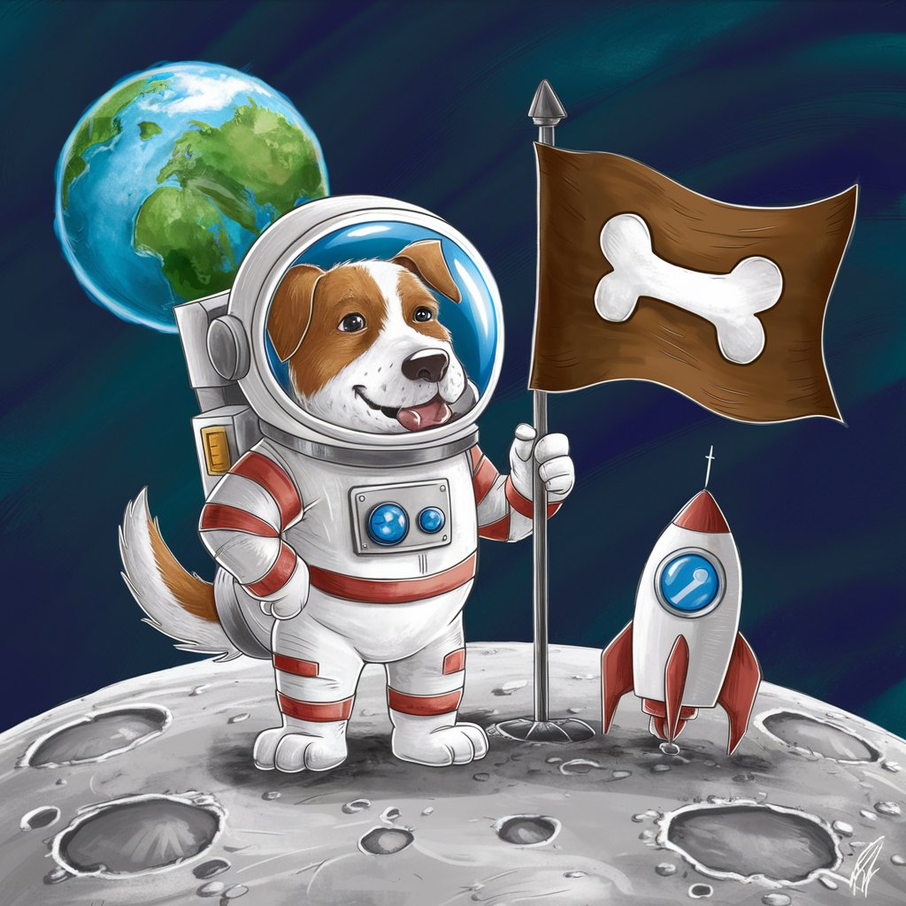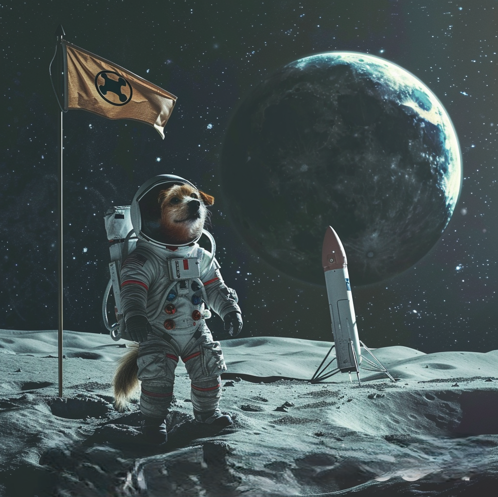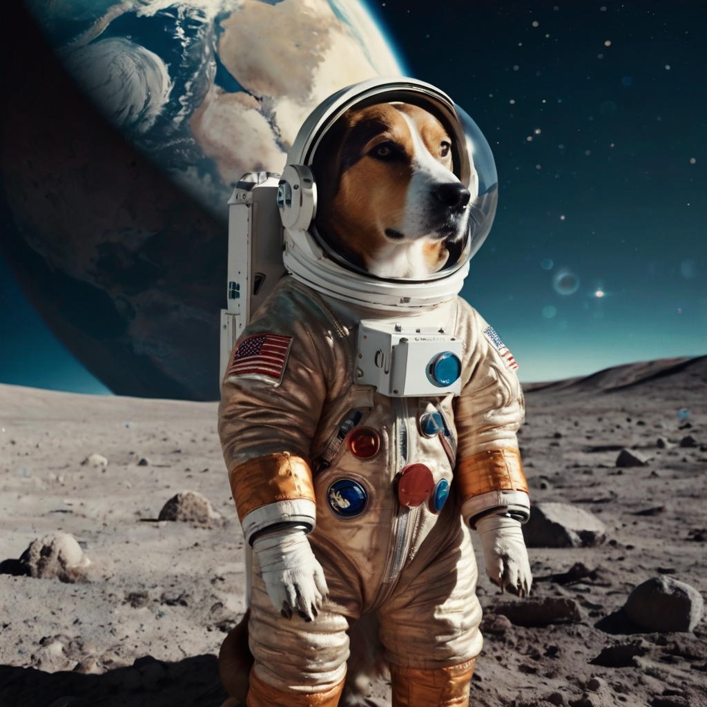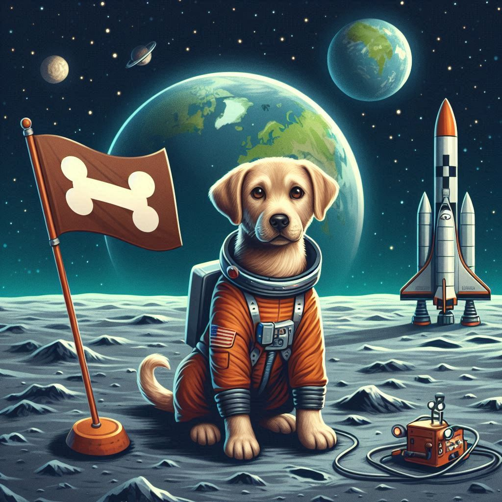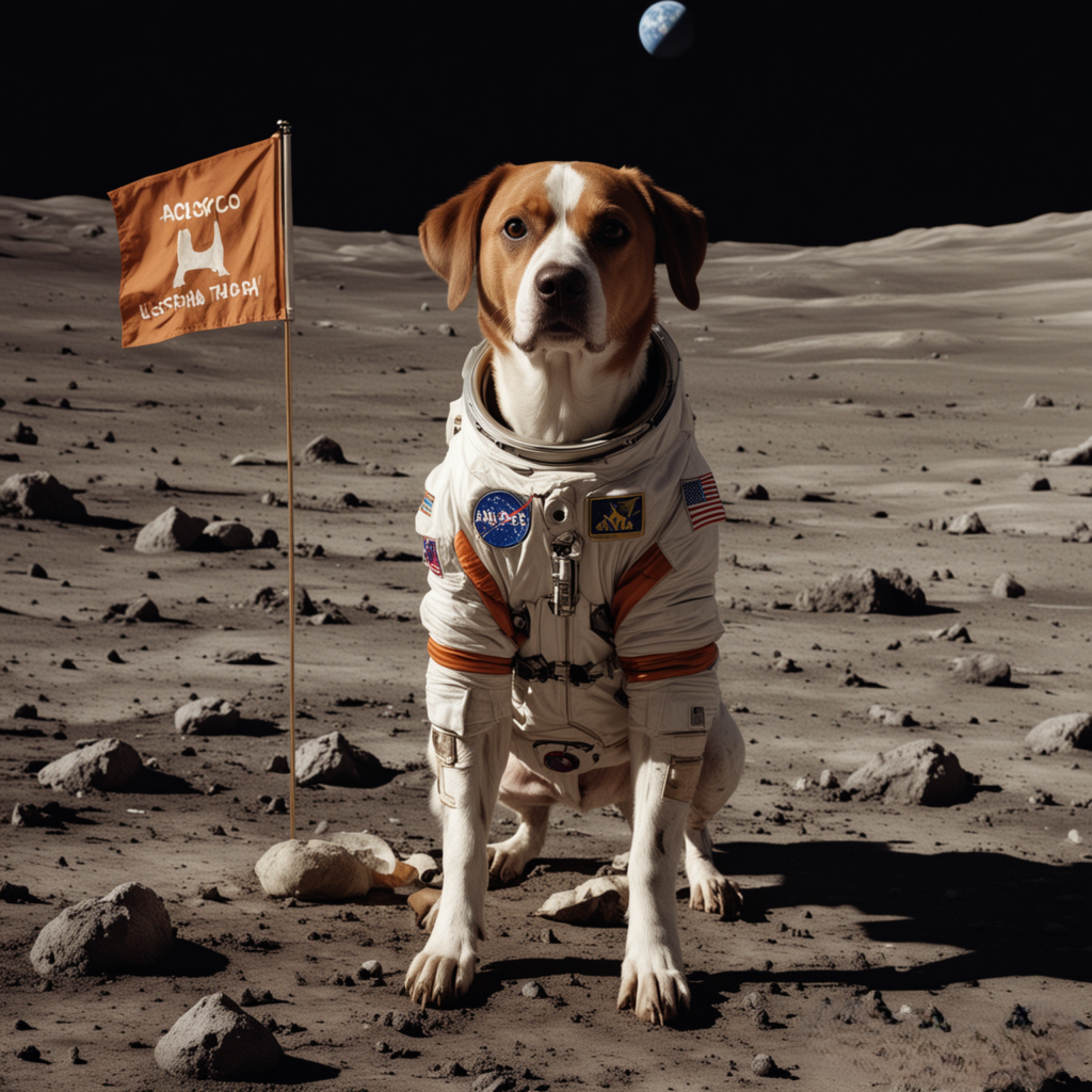 (Vygeneruj mi obrázek psa v astronautském obleku na povrchu měsíce sledujícího planetu Zemi v dáli. Vedle psa by měla být hledá vlajka se symbolem kosti a raketa podobná Apollu 11.)